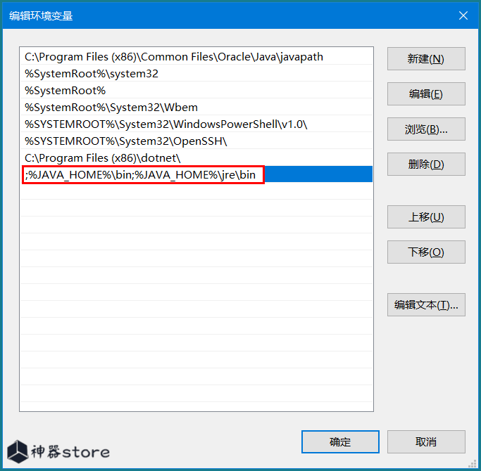 7.找到Path变量,在里面添加一行“;%JAVA_HOME%in;%JAVA_HOME%jrein”