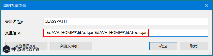 6.继续创建变量“CLASSPATH”,变量名为“.;%JAVA_HOME%libdt.jar;%JAVA_HOME%lib ools.jar;”(直接将引号里面的字段全部复制粘贴进去,注意开头有个.;)