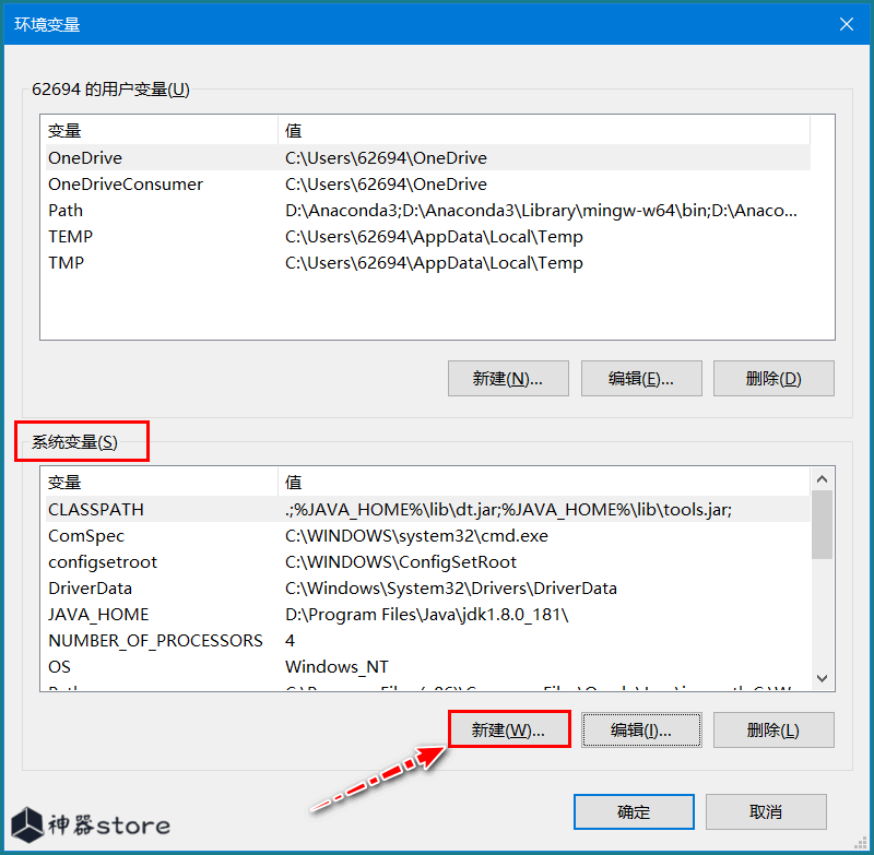 4.在“系统变量”下点击“新建”。