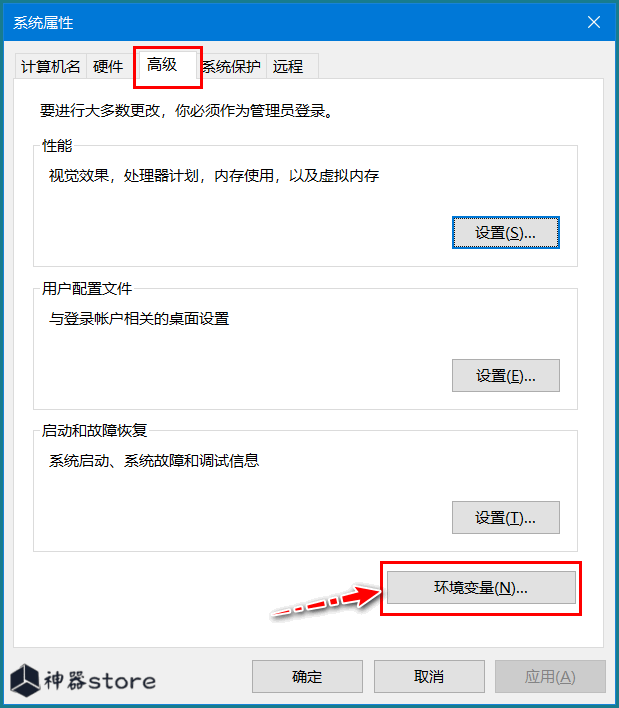 3.选择“高级”,然后点击“环境变量”。