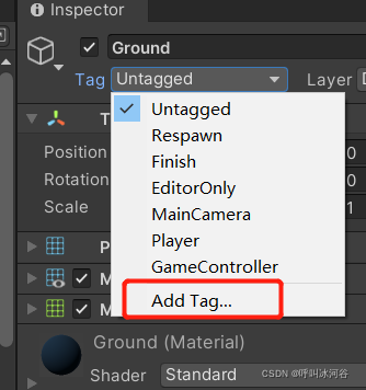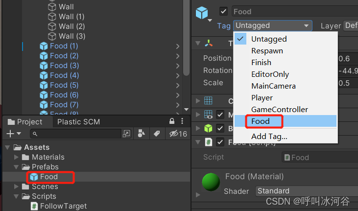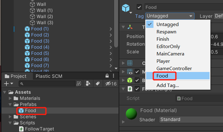 添加一个Food标签,然后将预制体的Tag设置为此标签(设置标签是为了批量处理某一些相同标签的对象,如这里是为了判断小球碰撞到了哪些物体)