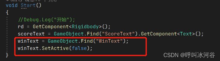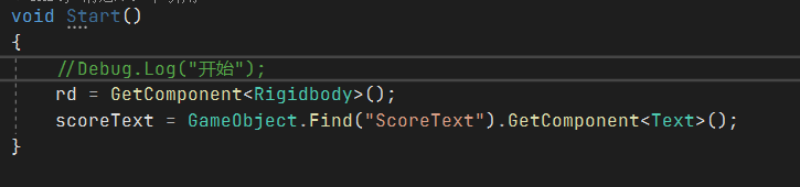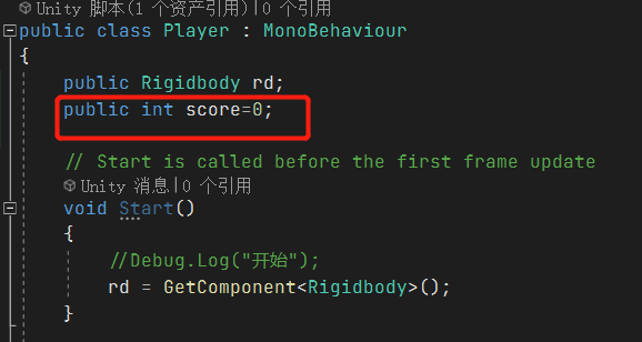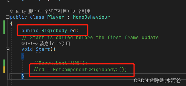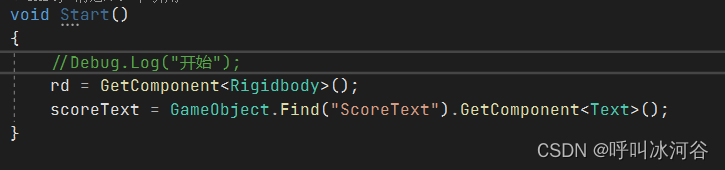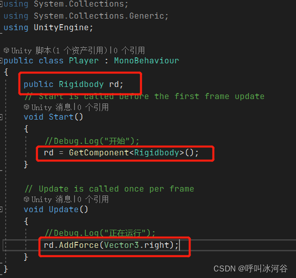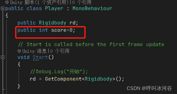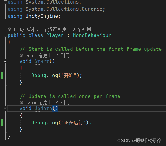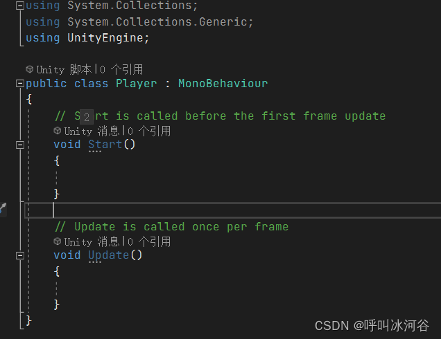 双击创建的script文件即可用vs打开(确保此文件名与类名一致),代码中start方法用于游戏开始前的初始化工作,update方法用于游戏运行中的更新操作(每帧调用一次,每秒60帧)