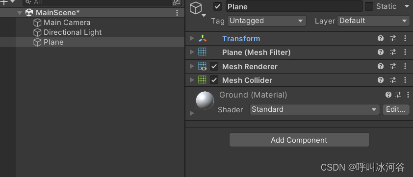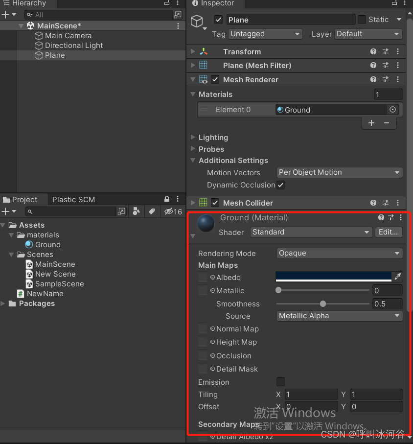 细心的人会发现在Plane对象中也会把Ground材质展示出来,这其实是为了方便我们快速对应材质并修改(当材质和对象很多时这样是很方便的)