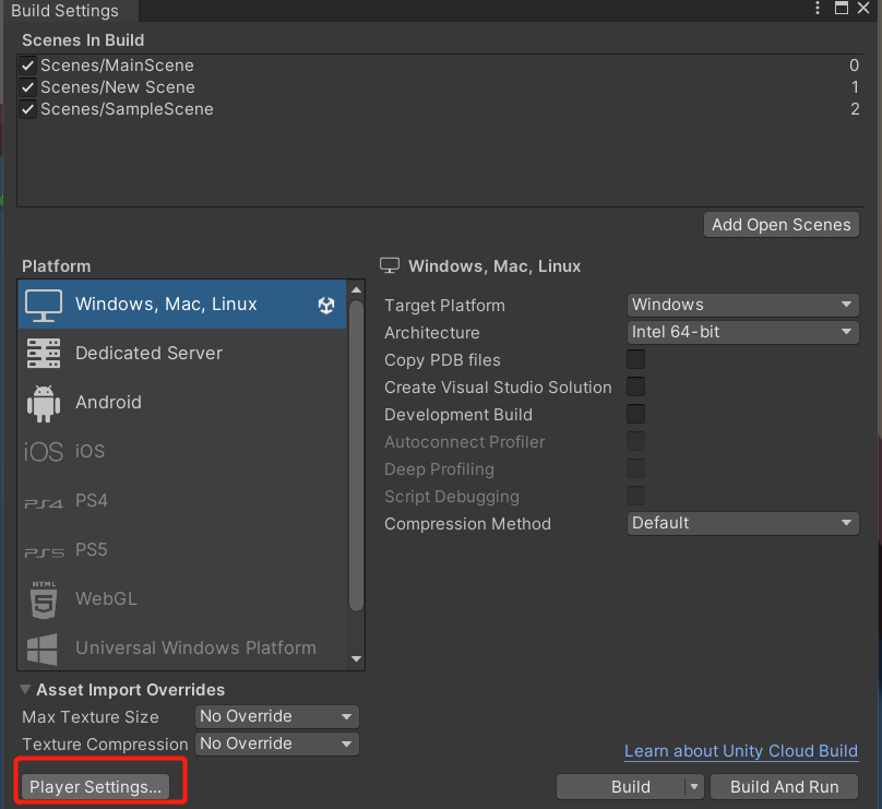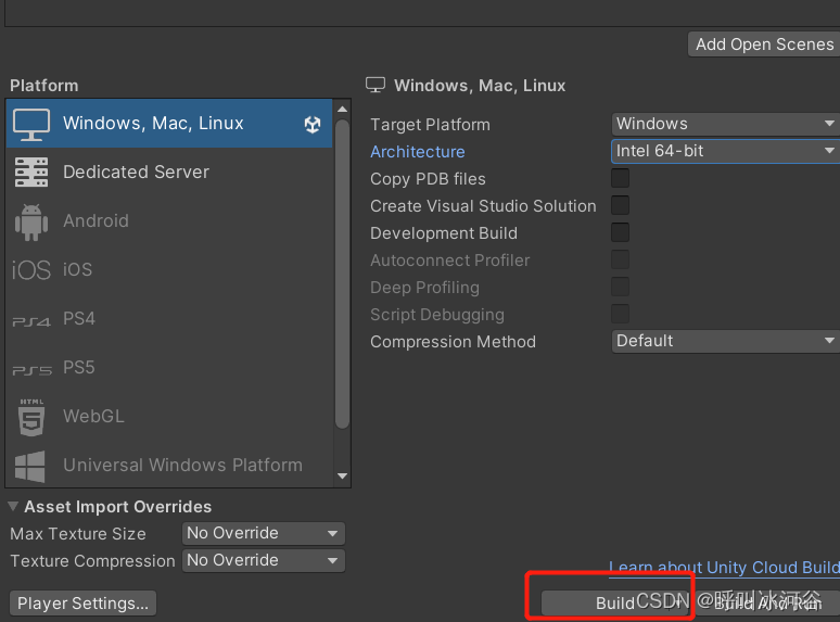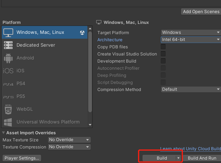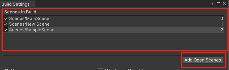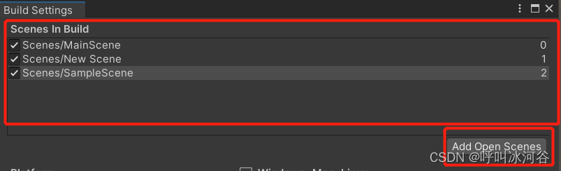 File->Build Settings->Add Open Scenes,如果右多个场景则将其拖到大文本框中,默认显示第一各场景,其他场景需要代码调整才会跳转