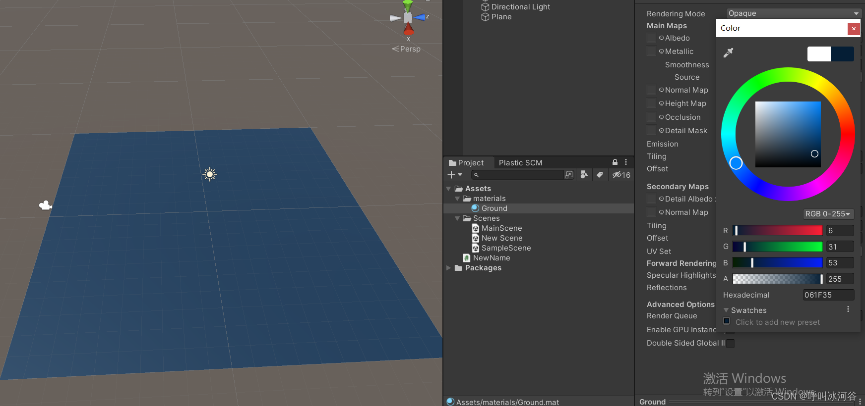 下面介绍下Plane游戏对象的组件构成,Transform组件用于指定对象的位置、旋转、缩放;Mesh Filter组件用于指定该对象是一个什么类型对象;Mesh Renderer用于设置对象形态属性;Mesh Collider用于设置碰撞检测(一般会做两套建模,一套用来显示对象具体形象,另一套会简化用于碰撞检测的模型,例如RPG游戏,人物会用胶囊体作为碰撞检测模型,但FPS类游戏就不行)。我们在点击Gound进入到设置界面,然后单击这个位置就会弹出选色板,最后选择自己喜欢的颜色就可以了