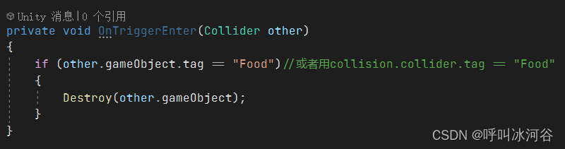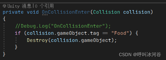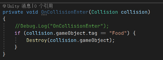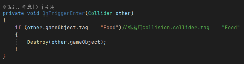 当小球碰撞到标签为Food的物体时,销毁被碰撞物体