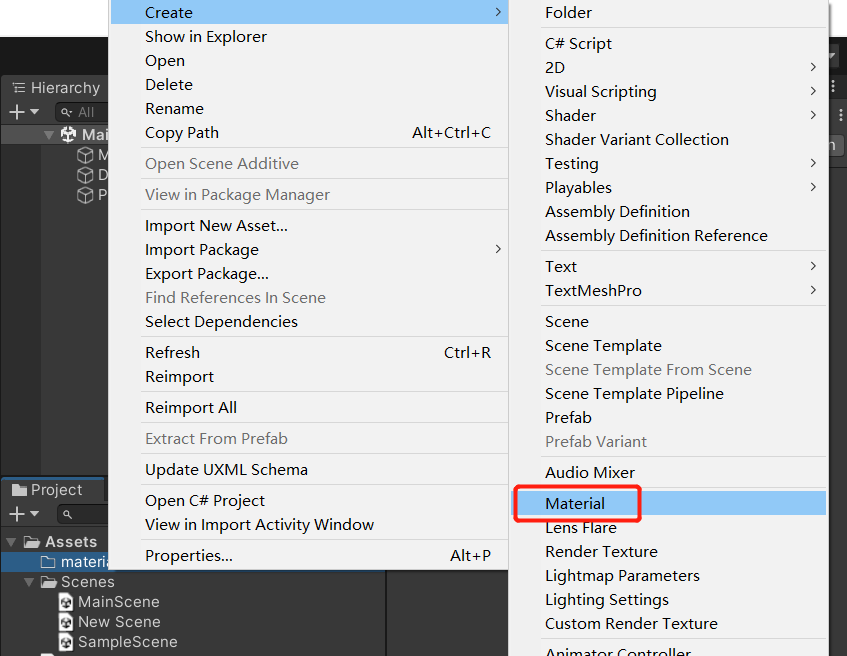 然后我们想要改变地面对象的颜色需要这样做:首先在Assets目录下新建一个materials文件夹,然后右键如图创建一个material并命名为Ground