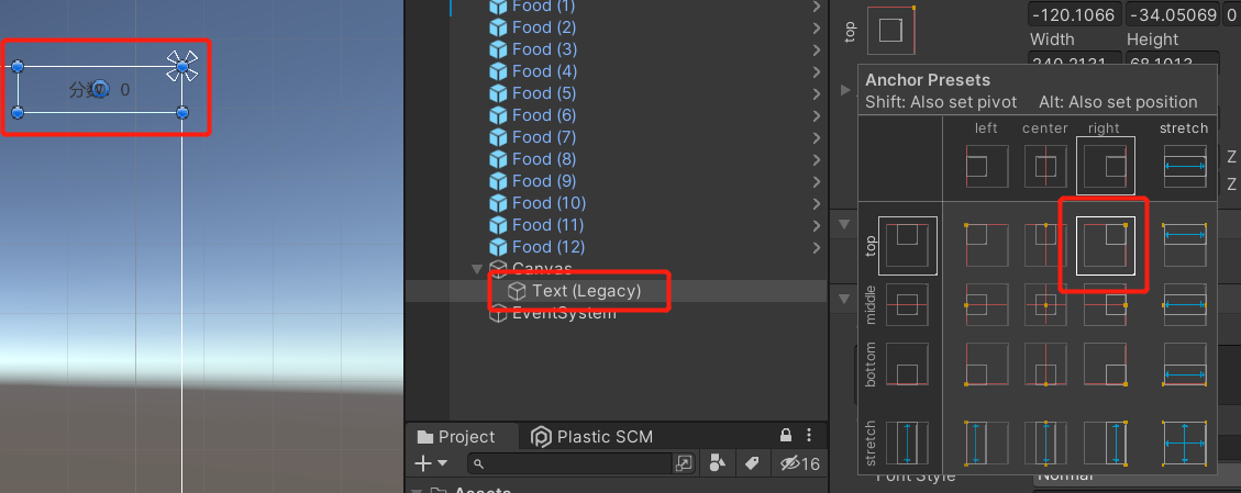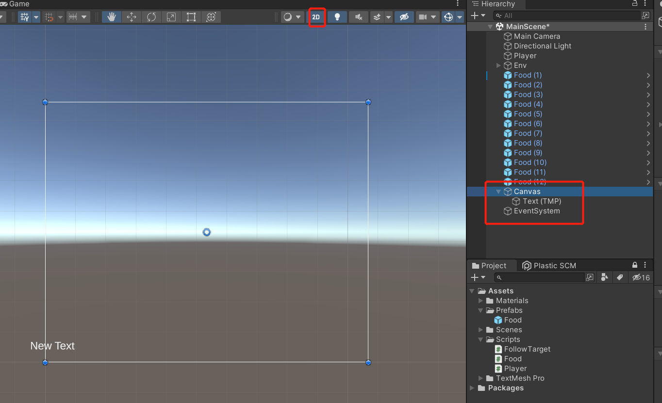 创建UI组件以显示分数,右键->UI->Legacy->Text即可,然后切换到2D模式下,双击此Canvas后,如图,所有的UI组件都会放在canvas下,EventSystem用于UI的事件处理(如点击等)