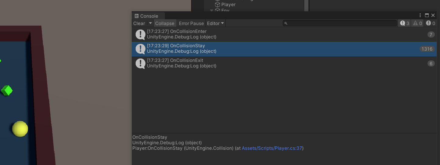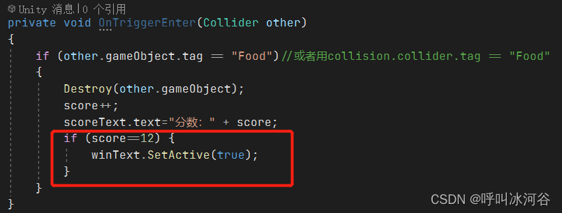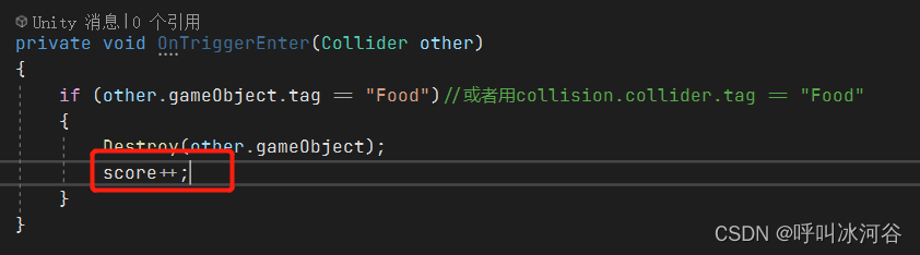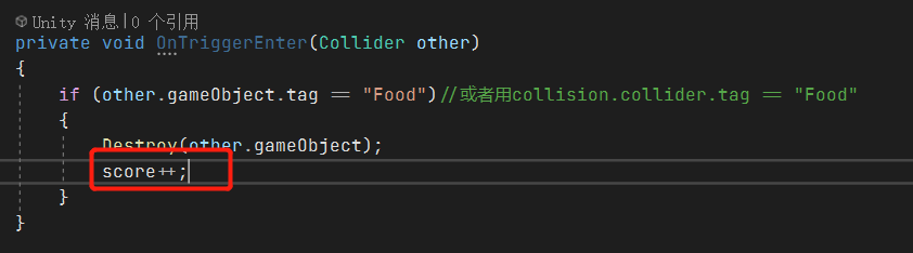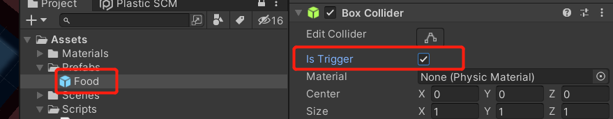 但我们在实际操作过程中会发现,当碰撞后小球会被Food阻挡一下,非常影响游戏体验,所以我们改用触发检测(即不会发生碰撞,小球会穿过物体)
