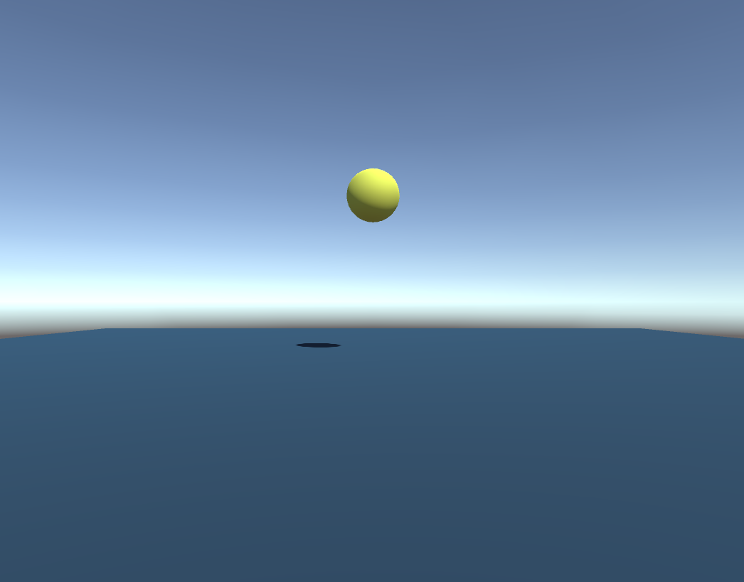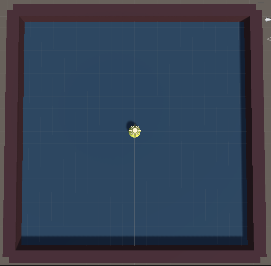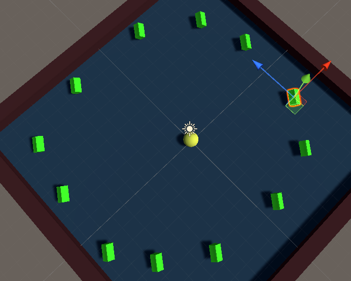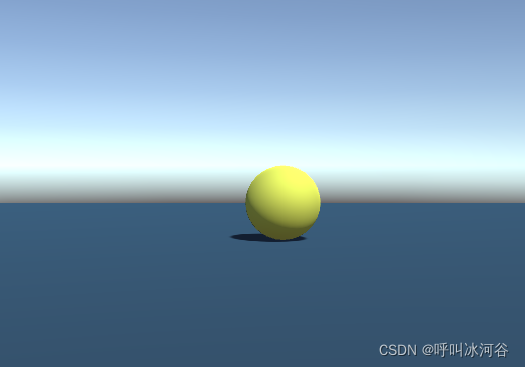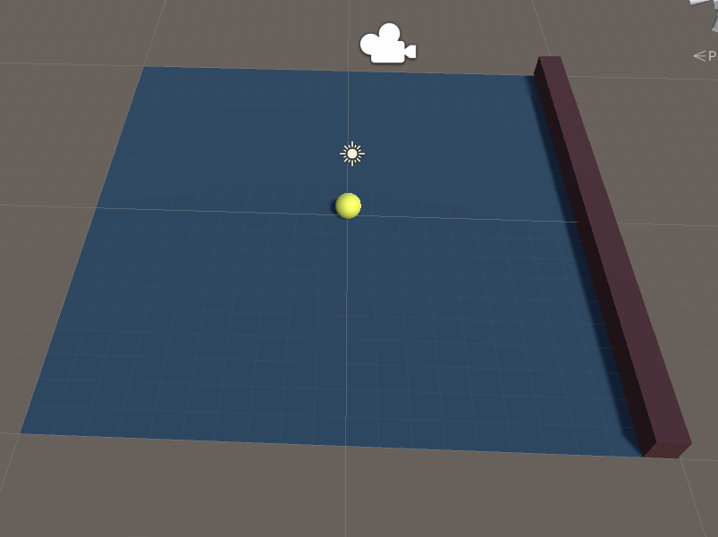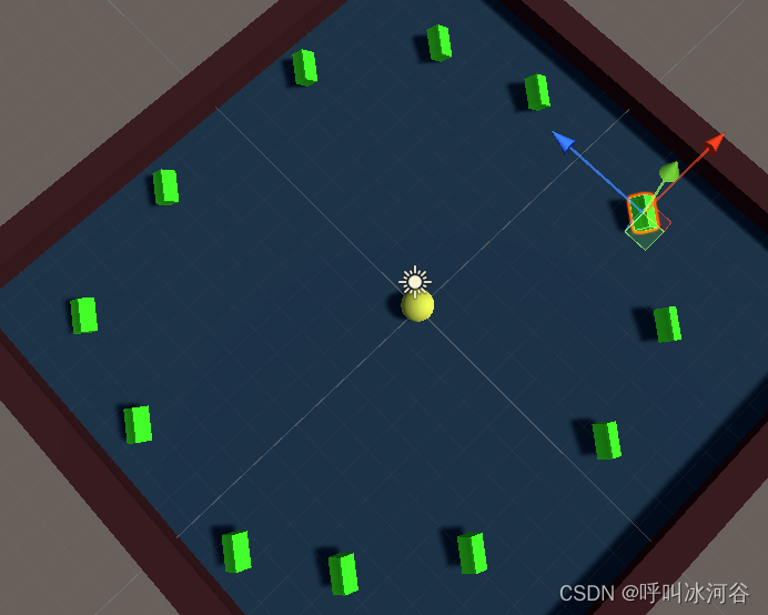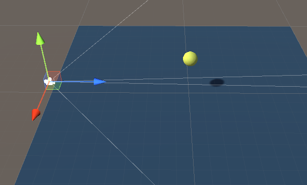 如图,在Scene面板下调整相机的高度和旋转度(即拉动绿色箭头往上一些,旋转红色环使相机朝下一些),然后将小球放在地板上(不要一开始下降了,注意小球本身直径为1m,所以设坐标为0,0.5,0)