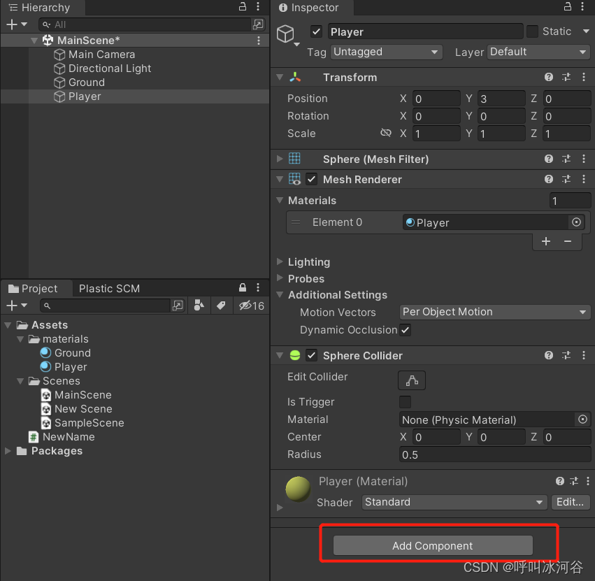 三、创建小球,并命名为Player,position指定为0,3,0,同时我们给之前的Plane也起个名字命名为Ground,同时按照相同的方法创建另一个material命名为Player给小球着色