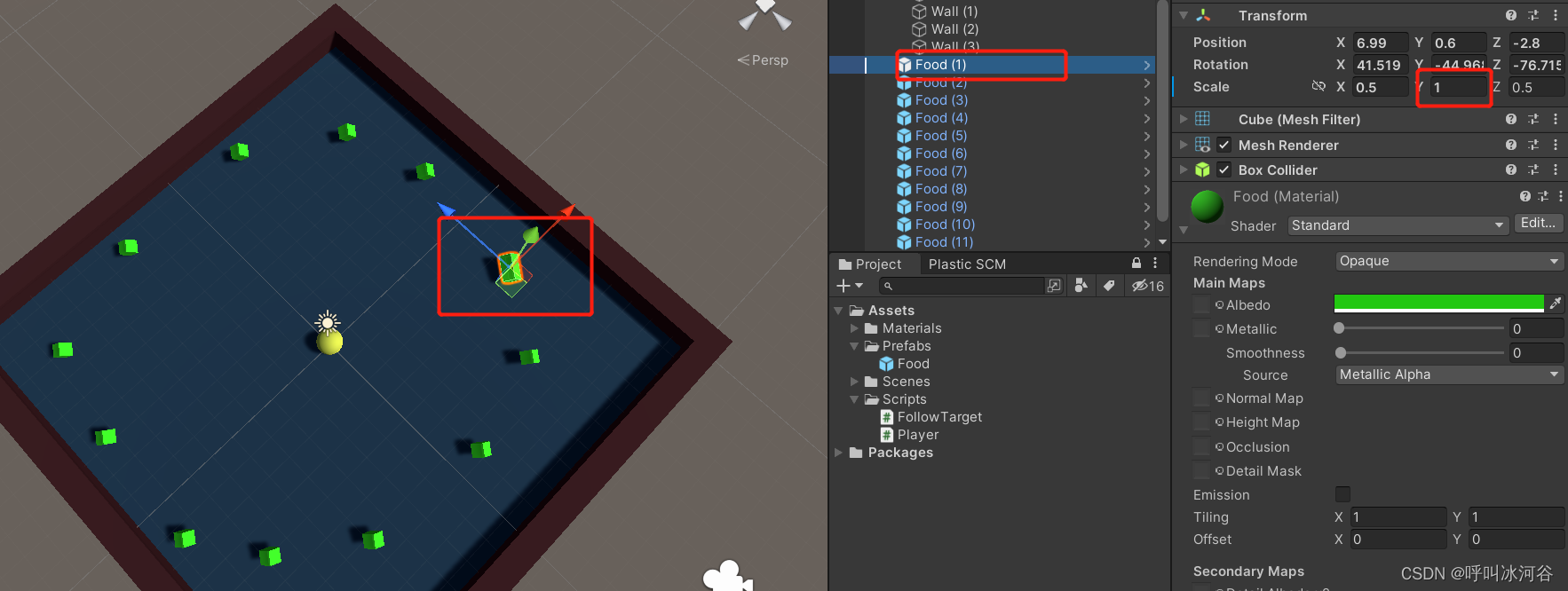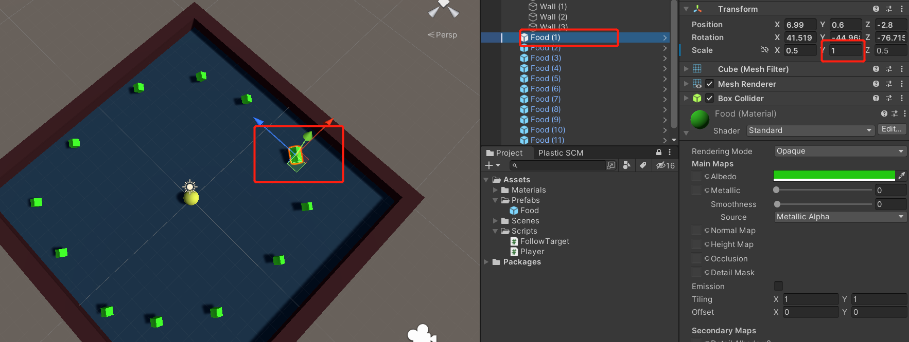 新建Cude,命名为Food,缩放比为0.5,0.5,0.5,旋转度数随意,设置Material(不光滑、颜色)。创建Prefabs预制体文件夹,将刚才创建好的Food拖到该文件夹中,这样此Food就可以作为模板多次使用且修改配置只需修改此模板即可