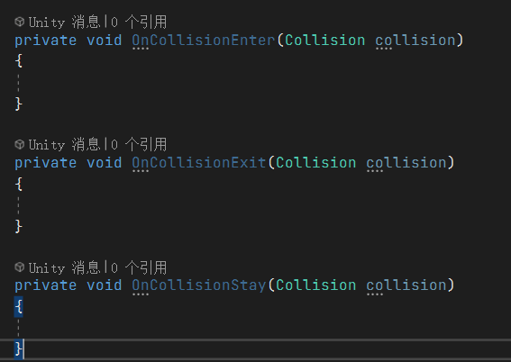 OnCollisionEnter:碰撞发生了(即两个物体刚刚接触)