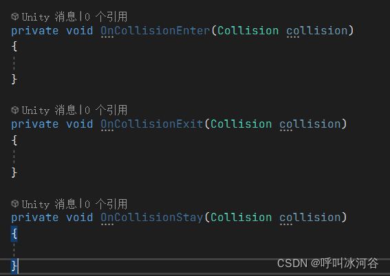 OnCollisionExit:碰撞结束了(即两个物体脱离接触)