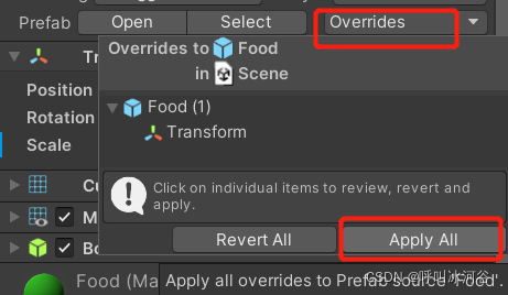 如果想让一个子对象的属性赋给预制体,可旋转如图Apply All