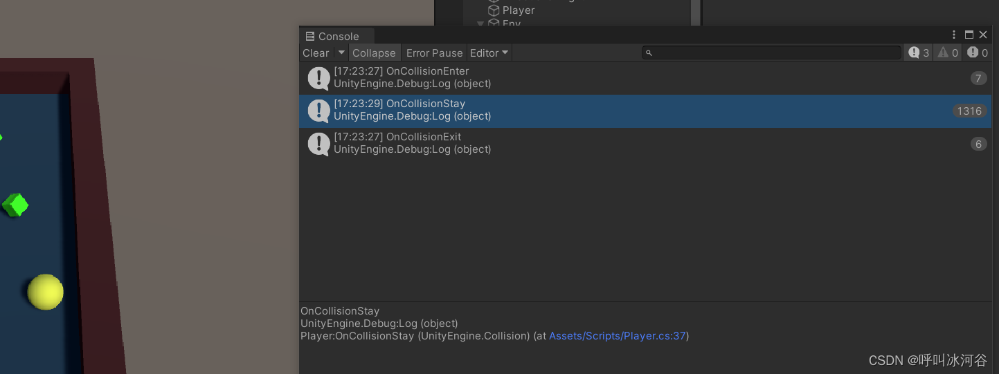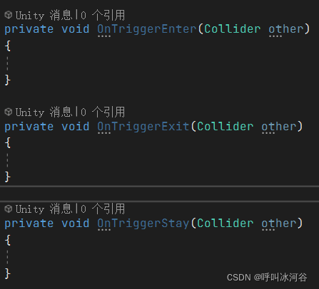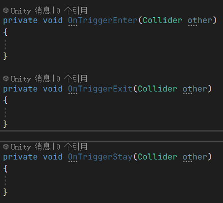 为小球(Player)设置碰撞检测逻辑,在Player脚本下新建三个方法,如图: