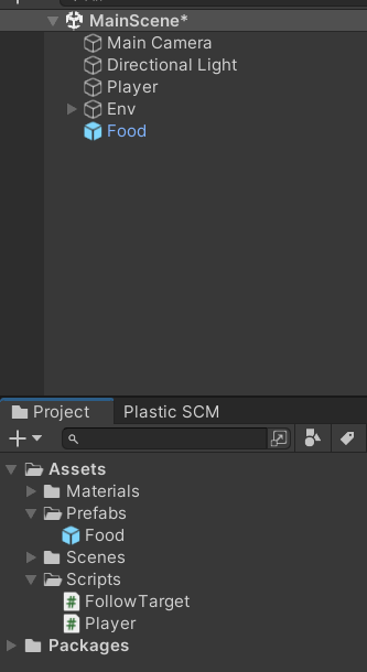 使用预制体创建相同类型游戏对象,方法一:在Project面板,直接拖到游戏场景中;方法二:直接复制Hierarchy面板的Food(推荐,因为可以保留位置等属性)(预制体和其子对象,可以理解为类和对象的关系)