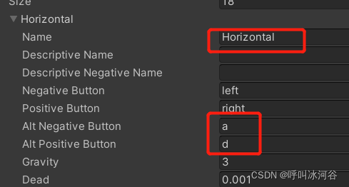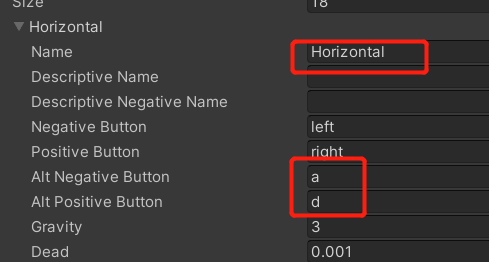 如果不想用WASD去控制上下左右,可以在这里设置:Project Settings->Input Manager->Axes->Horizontal/Vertical(其中Horizontal与我们代码中float h = Input.GetAxis("Horizontal")的Horizontal相对应)