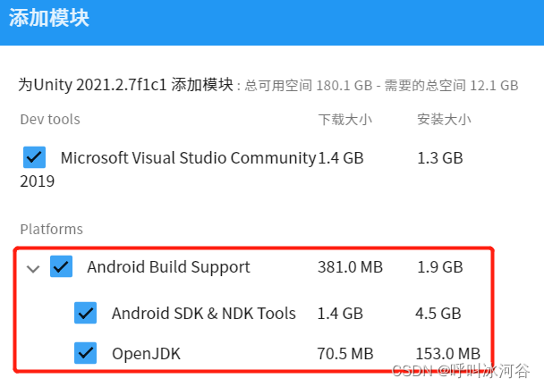 如果想在移动端发布,需要下载相关模块,打开UnityHub,勾选Android相关模块下载