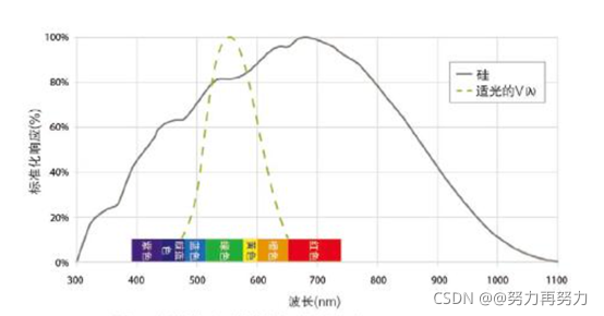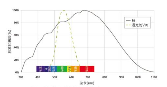 环境光传感器它是可以模拟人眼对可见光的响应机制,如下图所示,人眼可见光的范围一般再390nm~750nm之间,峰值在555nm。通常ALS传感器都包含一个光电二极管或光敏晶体管管,然而,光电二极管或晶体管的光谱响应介于300nm到1100nm之间,而峰值落在700nm左右。一个可靠的环境光传感器,挑战在于要让它能和人眼一样,可以看见390nm~750nm的波长,但不能对300~390nm的紫外光和750nm~1100nm的红外光有反应。