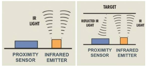 接近传感器是由发射器(红外发射二极管IR)、接收器(光电二极管PD)和检测电路组成。如图2-2,将发射器与接收器按照一点的夹角放置,当有物体出现在传感器前方时,会将发射出的红外线反射至PD上,通过检测反射的IR能量与反射时间,即可判断前方是否有物体并且可以得到物体距离。