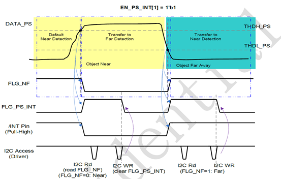 - 写入数据 :0X03,使能PS中断,选择PS_NF_MODE,如图4-2,当PS_ADC超过上限值THDH,INT_Pin输出持续为0,低于THDL,INT_Pin输出为1(视情况而定,本例只使能PS中断)。