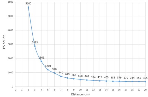如图4-3所示的是PS count 与距离之间的曲线图,遮挡物体为不透明的立方体硬纸盒。其中模块PS_Gain = 8x,PS_Integration_Time = 96uS。