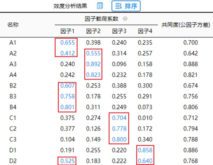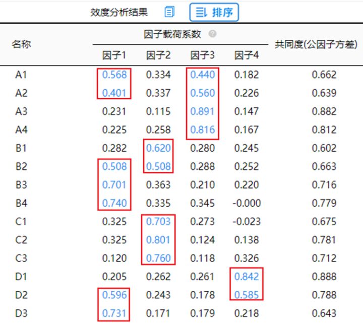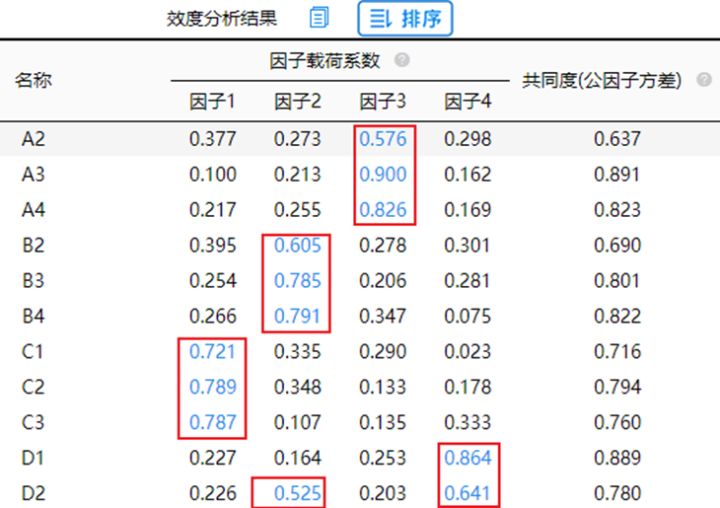总结上述分析可知:删除B1和D3这两项;而A1,A2,B2,D2共四项出现可以对应两个因子的现象,暂时不处理(进行关注即可)。