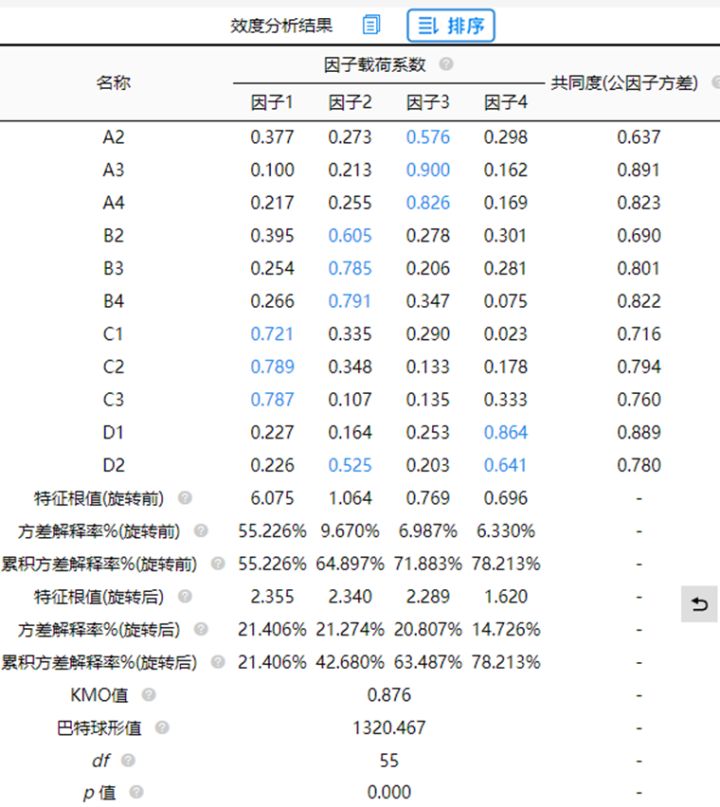 1. KMO值为0.876,大于0.6,数据可以被有效提取信息。另外,4个因子的方差解释率值分别是21.406%,21.274%,20.807%,14.726%,旋转后累积方差解释率为78.213%>50%。意味着研究项的信息量可以有效的提取出来。