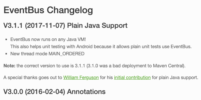 EventBus 诞生以来这么多年,在很多生产项目中都可以看到它的身影。而从更新日志可以看到,除了体积小,它还很稳定,这两年就没更新过,最后一次更新也只是因为支持所有的 JVM,让其使用范围不仅仅局限在 Android 上。