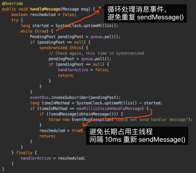 为了避免频繁的向主线程 sendMessage(),EventBus 的做法是在一个消息里尽可能多的处理更多的消息事件,所以使用了 while 循环,持续从消息队列 queue 中获取消息。