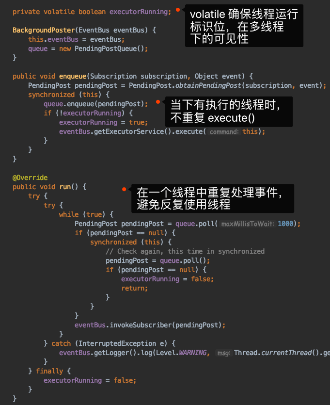 在一些编码规范里就提到,不要直接创建线程,而是需要使用线程池。EventBus 也遵循这个规范,在 BackgroundPoster 中,就使用了 EventBus 的 executorService 线程池对象去执行。
