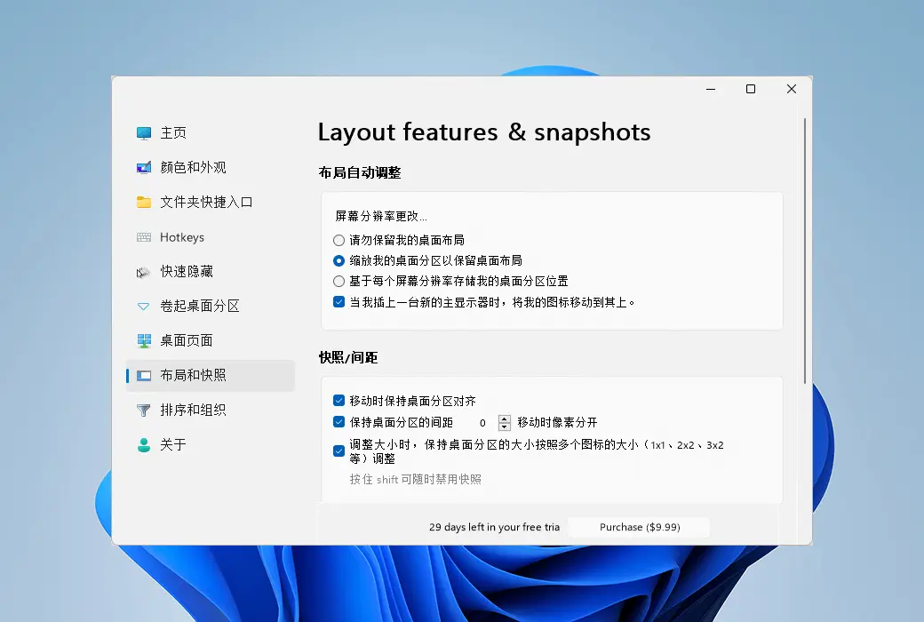 Fences 4 提供了多种排列方式,使你的桌面更加简洁、美观和高效。它还支持随时调整桌面图标的大小、位置、透明度等属性,帮助你快速自定义你的桌面。