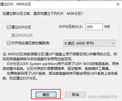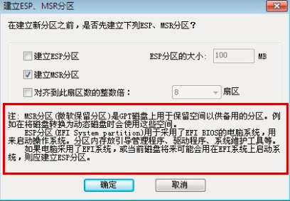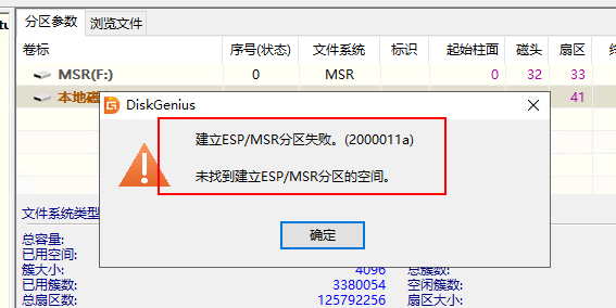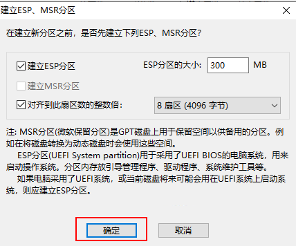 原因1:这个硬盘是已经分区,而且没有空闲分区来创建esp分区,解决方法使用dg分出一部分空间做esp分区.