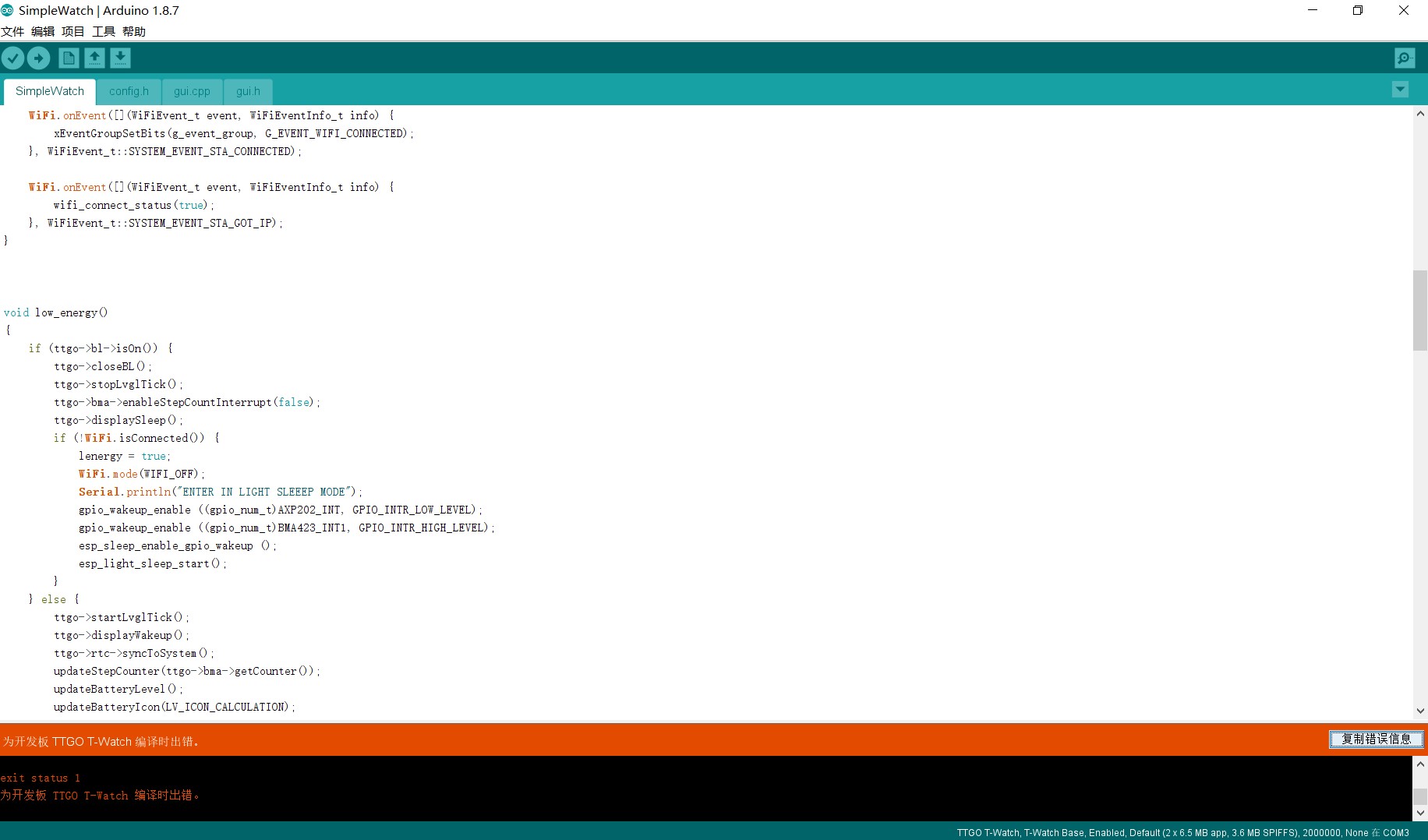 Arduino:1.8.7 (Windows 10), 开发板:"TTGO T-Watch, T-Watch Base, Enabled, Default (2 x 6.5 MB app, 3.6 MB SPIFFS), , None" 警告:库 ESP RainMaker 中的分类 '' 不可用。设置为 'Uncategorized' 警告:库 WiFiProv 中的分类 '' 不可用。设置为 'Uncategorized' xtensa-esp32-elf-g++: error: unrecognized command line option '-mfix-esp32-psram-cache-strategy=memw' exit status 1 为开发板 TTGO T-Watch 编译时出错。 在文件 -> 首选项开启 “编译过程中显示详细输出”选项 这份报告会包含更多信息。