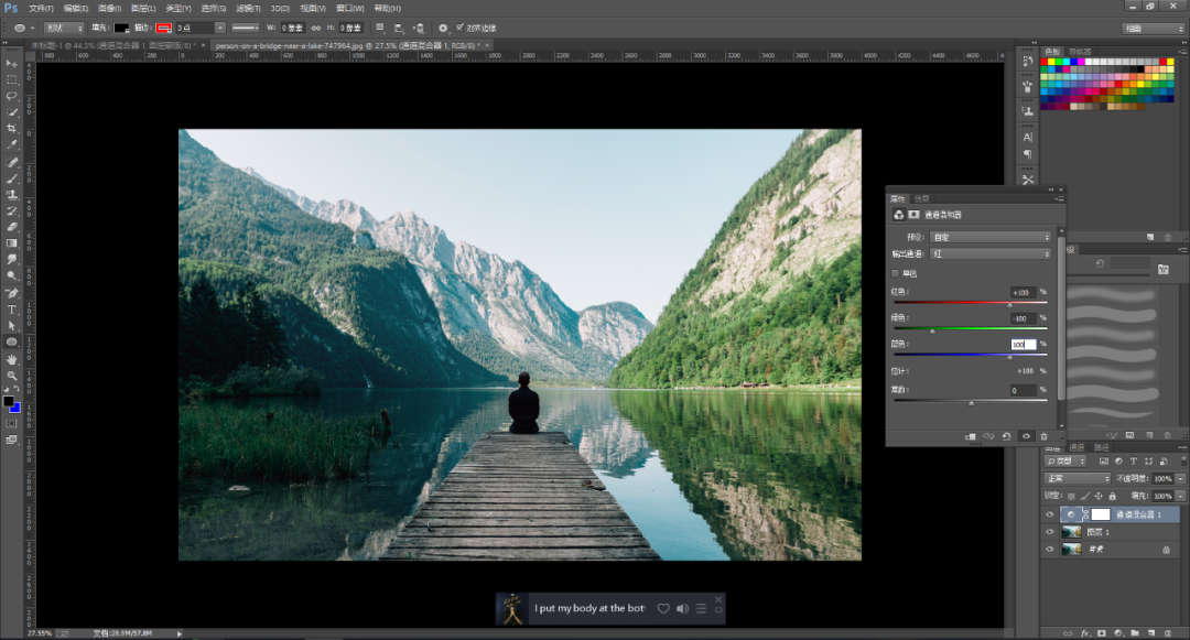 5.2 向左拖动绿色颜色条后我们发现天空山体都变青了(因为天空、山体也含有绿色的元素,红色对绿色的影响减少之后,绿色相对增强,绿与蓝色混合为青),因此为了使其余部分影响减小,我们削弱蓝色:在蓝**域增加红色(向右拖动蓝色颜色条)如此就完成了