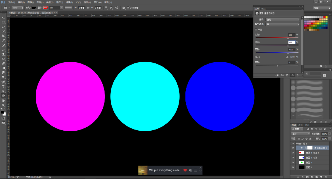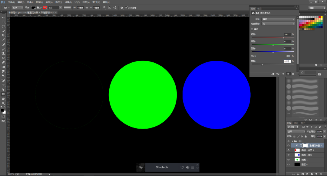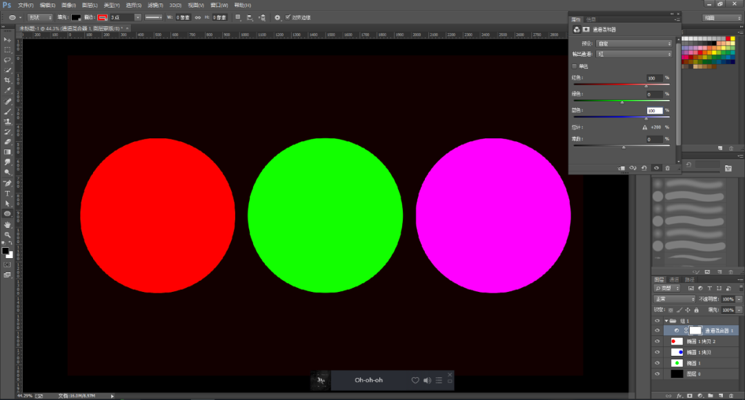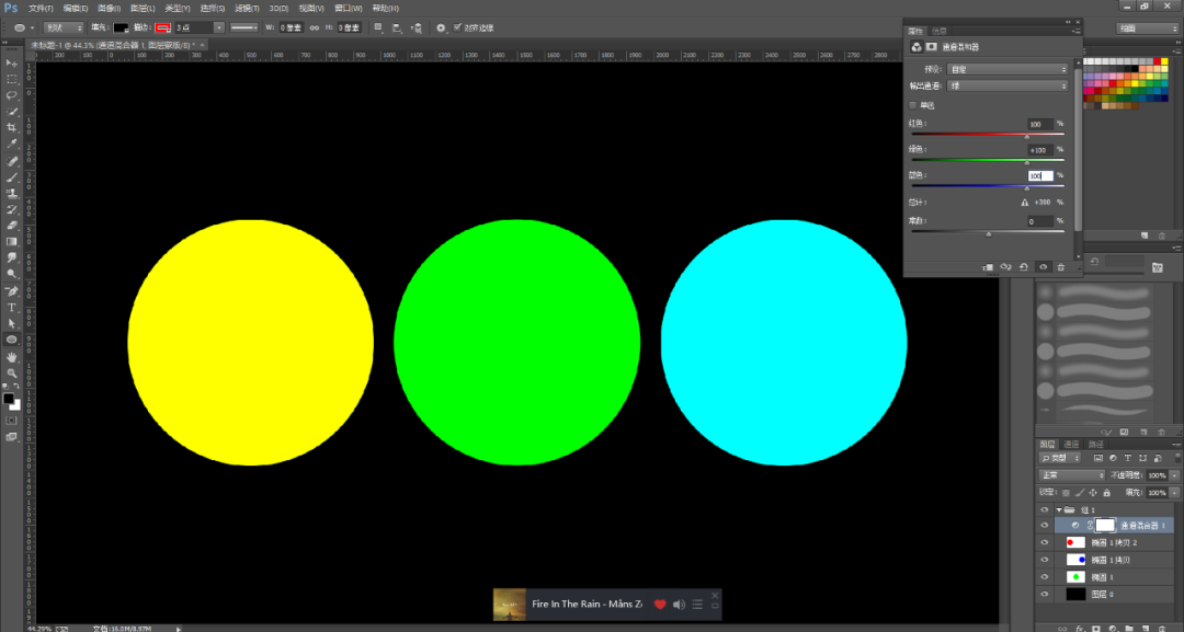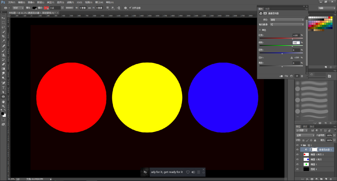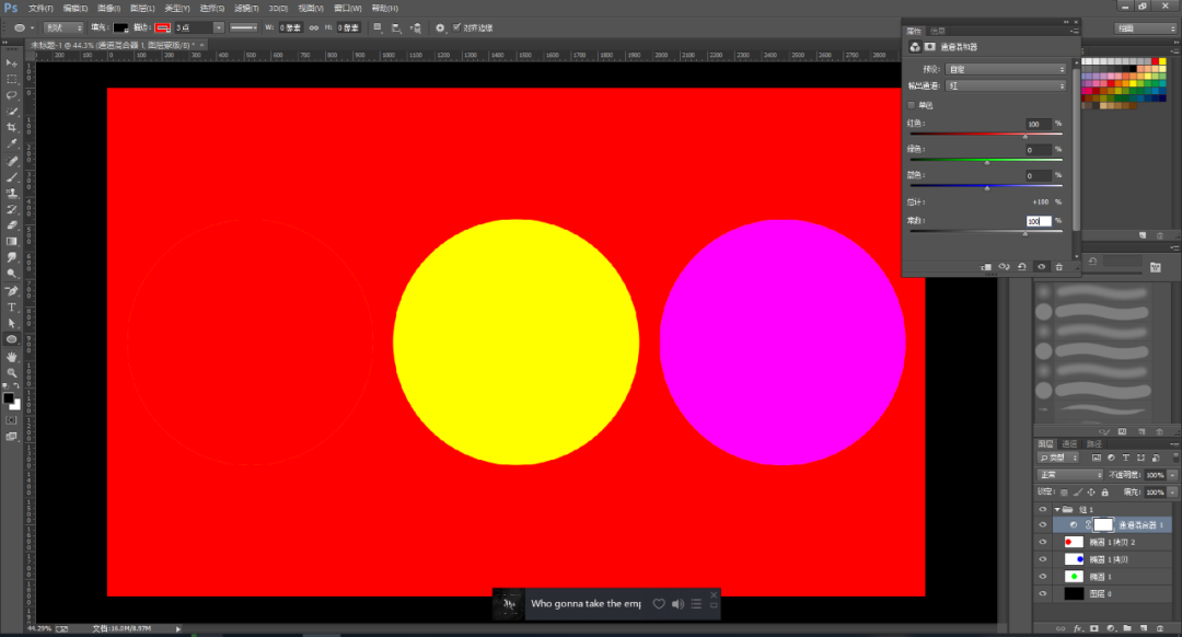 4.1 原图有红、绿、蓝三圆,此时为红色输出通道(也就是增加或减少的是红色),为了使绿圆变成黄圆,我们想一想三原色图(见图3.1),可知黄=红+绿,所以我们在绿**域增加红色(也就是向右滑动绿色条至100%),结果如下图所示: