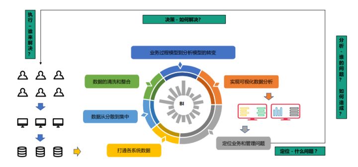 完成信息化基础建设后,企业可以部署商业智能BI,将各部门数据库中的数据以ETL和数据模型进行处理,统一储存到数据仓库,由分析人员以图形化手段,将数据进行数据分析,制作数据可视化报表,追踪业务执行效果,进行复盘预测,为管理人员提供信息支撑,辅助进行决策。