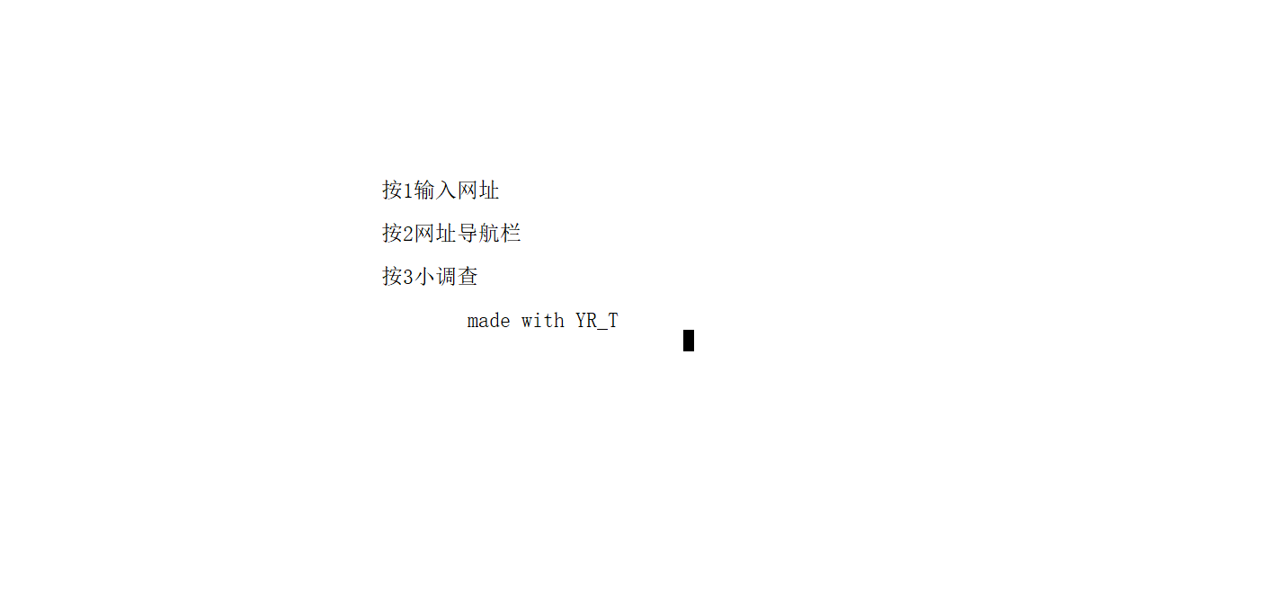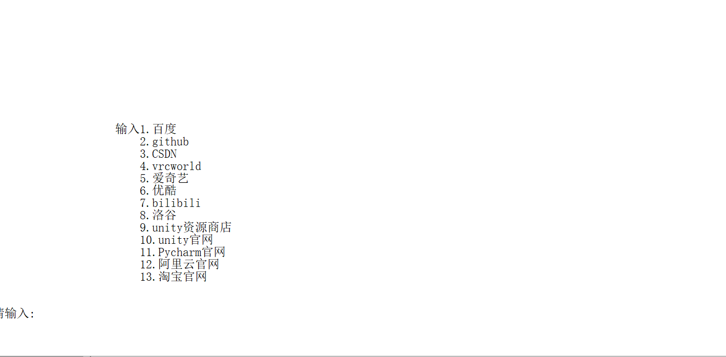 #include<windows.h> #include<iostream> #include<conio.h> #include<string> using namespace std; void out(string o) { for(int i=0;i<o.size();i++)//输出 { cout<<o[i]; Sleep(80); } } string str(string n) { n = "start " + n;//打开的网址 因为用system打开 所以要拼接 return n; } void pos(long long x, long long y, string str) { for (long long i = 1; i <= x; i++) cout<<endl;//在第几行输出 是第几列就输出多少个endl for (long long i = 1; i <= y; i++) cout<<" ";//在第几列输出 是第几列就输出多少个空格 cout << str; return; } void move(int x, int y) { COORD pos = { x,y }; HANDLE hOut = GetStdHandle(STD_OUTPUT_HANDLE);// 获取标准输出设备句柄 SetConsoleCursorPosition(hOut, pos);//两个参数分别是指定哪个窗体,具体位置 } int main() { system("color F0");//颜色 start: for(int i=0;i<8;i++)cout<<endl;//行 cout<<" ";//列 out("按1输入网址"); cout<<endl<<endl; cout<<" "; out("按2网址导航栏"); cout<<endl<<endl; cout<<" "; out("按3小调查"); cout<<endl<<endl; cout<<" "; out("made with YR_T"); int ch=_getch(); while(ch!='1'&&ch!='2'&&ch!='3')ch=_getch(); if (ch=='1') { system("cls"); for(int i=0;i<8;i++)cout<<endl;//行 cout<<" ";//列 out("网址打开"); pos(1,15,"-----------------------------------------------------"); pos(1,15,"|输入网址: |"); pos(1,15,"-----------------------------------------------------"); move(25,10);//移动光标到输入网址后面 string url; cin>>url; url = str(url);//网址前面加上start system(&url[0]);//打开 system("cls"); goto start;//虽然乱但好用 } if (ch=='2') { system("cls");//清屏 for(int i=0;i<11;i++)cout<<endl;//行 for(int i=0;i<20;i++)cout<<" ";//列 cout<<"输入1.百度"<<endl;// https://www.baidu.com for(int i=0;i<20;i++)cout<<" ";//列 cout<<" 2.github"<<endl;// https://github.com for(int i=0;i<20;i++)cout<<" ";//列 cout<<" 3.CSDN"<<endl;// https://csdn.net for(int i=0;i<20;i++)cout<<" ";//列 cout<<" 4.vrcworld"<<endl; // http://www.vrcworld.com/ for(int i=0;i<20;i++)cout<<" ";//列 cout<<" 5.爱奇艺"<<endl;// https://www.iqiyi.com/ for(int i=0;i<20;i++)cout<<" ";//列 cout<<" 6.优酷"<<endl;// https://www.youku.com/ for(int i=0;i<20;i++)cout<<" ";//列 cout<<" 7.bilibili"<<endl;// https://www.bilibili.com/ for(int i=0;i<20;i++)cout<<" ";//列 cout<<" 8.洛谷"<<endl;// https://www.luogu.com.cn/ for(int i=0;i<20;i++)cout<<" ";//列 cout<<" 9.unity资源商店"<<endl;// https://assetstore.unity.com/ for(int i=0;i<20;i++)cout<<" ";//列 cout<<" 10.unity官网"<<endl;// https://unity.cn/ for(int i=0;i<20;i++)cout<<" ";//列 cout<<" 11.Pycharm官网"<<endl;// https://www.jetbrains.com/pycharm/ for(int i=0;i<20;i++)cout<<" ";//列 cout<<" 12.阿里云官网"<<endl; for(int i=0;i<20;i++)cout<<" ";//列 cout<<" 13.淘宝官网"<<endl; for(int i=0;i<20;i++)cout<<" ";//列 cout<<endl<<endl; cout<<"请输入:"; int s; cin>>s; if (s==1) system("start https://www.baidu.com");//直接打开 if (s==2) system("start https://github.com"); if (s==3) system("start https://csdn.net"); if (s==4) system("start http://www.vrcworld.com/"); if (s==5) system("start https://www.iqiyi.com/"); if (s==6) system("start https://www.youku.com/"); if (s==7) system("start https://www.bilibili.com/"); if (s==8) system("start https://www.luogu.com.cn/"); if (s==9) system("start https://assetstore.unity.com/"); if (s==10) system("start https://unity.cn/"); if (s==11) system("start https://www.jetbrains.com/pycharm/"); if (s==12) system("start https://www.aliyun.com/"); if (s==13) system("start https://www.taobao.com/"); system("cls"); goto start; } if (ch=='3') { system("cls"); for(int i=0;i<8;i++)cout<<endl;//行 for(int i=0;i<25;i++)cout<<" "; cout<<"1.请问这个程序实用吗?A.很实用 B.还行 C.不实用 D.这作者这是做的什么玩意"; cout<<endl<<"请输入:"; char p[64],ch; int i=0; while (true) { ch=getch();//无回显的输入 p[i++] = ch; if (ch=='\r'||ch=='\b')//getch()函数如果读到回车符号返回'/r' { p[i] = '\0'; break; } putchar('A'); } cout<<endl<<"感谢您的鼓励!"; Sleep(1000); out("给你讲个故事"); cout<<endl; out("有一天,你把 main.cpp里代码全部删掉,把我的代码复制进去------------------------------------"); out("<<气岸头明>>"); cout<<endl; out("呵呵呵..."); Sleep(1000); system("cls"); goto start; } return 0; }