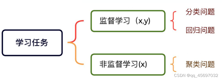 监督学习的训练数据由两部分组成:描述事件/对象的特征向量(x),以及 ground-truth 的标签(y)。而非监督学习的训练数据只有一个部分:描述事件/对象的特征向量(x),但是没有标签(y)。分类问题和回归问题是监督学习的代表,聚类学习是非监督学习的代表。