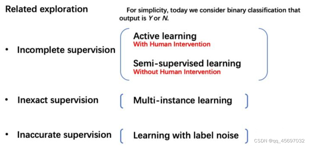 - inaccurate supervision:训练集样本不一定可信。