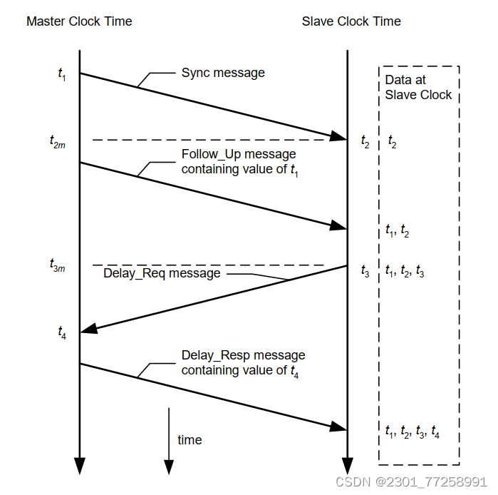 主机发送sync报文,此时,主机记录发送sync报文的时间,这个被称之为T1,并且,在sync报文中,包含了主机的时间(真实时间),注意,此时从机不知道T1的时间,从机现在只是知道了真实时间(是从报文中解析出来的),从机收到了主机发送的sync报文,记录一下时间,这个是T2,从机现在有两个时间了,一个是T2