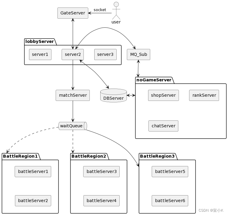 - 非状态服务(noGameServer):当用户打开商城、搜索好友、聊天等操作时,就是在和非状态服务模块进行交互。考虑到这类操作一般实时性不高,但qps量大,大厅服务与非状态服务之间通过消息队列、总线等方式进行通信