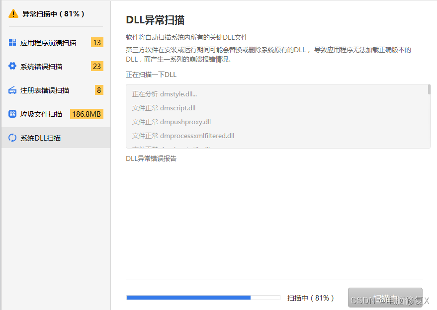 点击一键修复dll错误的按钮,就会自动的帮你扫描电脑系统中缺失的dll文件