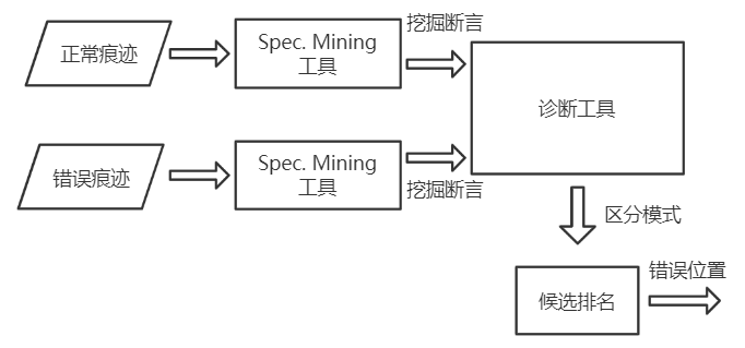 断言可以在本地化硅后缺陷中发挥重要作用,特别是当我们从处理器核心转向通用设计时。一种明显的方法是在模块接口上编写断言,然后合成片上监视器来检查这些断言是否被满足或违反。在发生故障时,可以使用此输出。然后,失败断言可以帮助将失败本地化到模块边界。不过,这种方法的挑战在于首先获取相关的断言。最近的工作展示了如何以可扩展的方式自动挖掘形式化断言的模拟跟踪,并可以有效地将错误(由bug引起的)定位到模块边界。如图3所示,总体思想是找到由正确的系统跟踪(例如,记录的前硅)而不是错误跟踪所满足的断言。然后,这些区分性的断言会根据一些指标进行排名,比如首次失败的时间。 然后假设错误的位置是具有最高级别区分断言的模块。