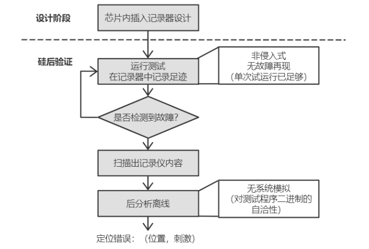 - 系统级仿真 :为了获得“黄金响应”,即整个系统(如处理器和主板上的所有外围设备)的每个时钟周期的正确信号值,必须运行昂贵的系统级仿真。运行系统级模拟可能比实际硅慢7-8个数量级。此外,需要昂贵的外部逻辑分析仪来记录所有通过外部引脚进入和退出系统的信号值。由于上述因素,一个功能性错误通常需要数小时到数天的定位,而电气错误则需要数天到数周的本地化和更昂贵的设备。