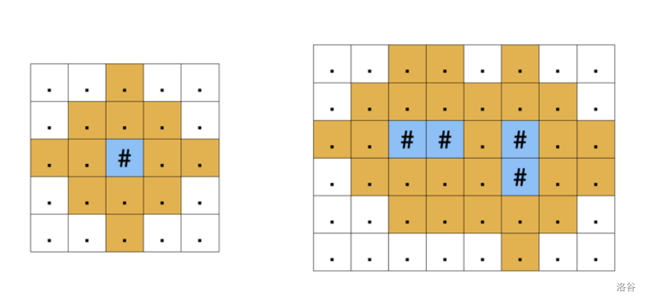 虽然卫星照片可以清楚的辨别出陆地和水域,但陆地的具体类型却并不明确。现在我们了解到,对于一块是水域的方格,它向上、下、左、右四个方向 k k k 步之内可达的陆地格子,均会形成沙滩。例如,下图展示了 k = 2 k=2 k=2 的情况,蓝色的格子代表水域,标为黄色的陆地格子是沙滩。