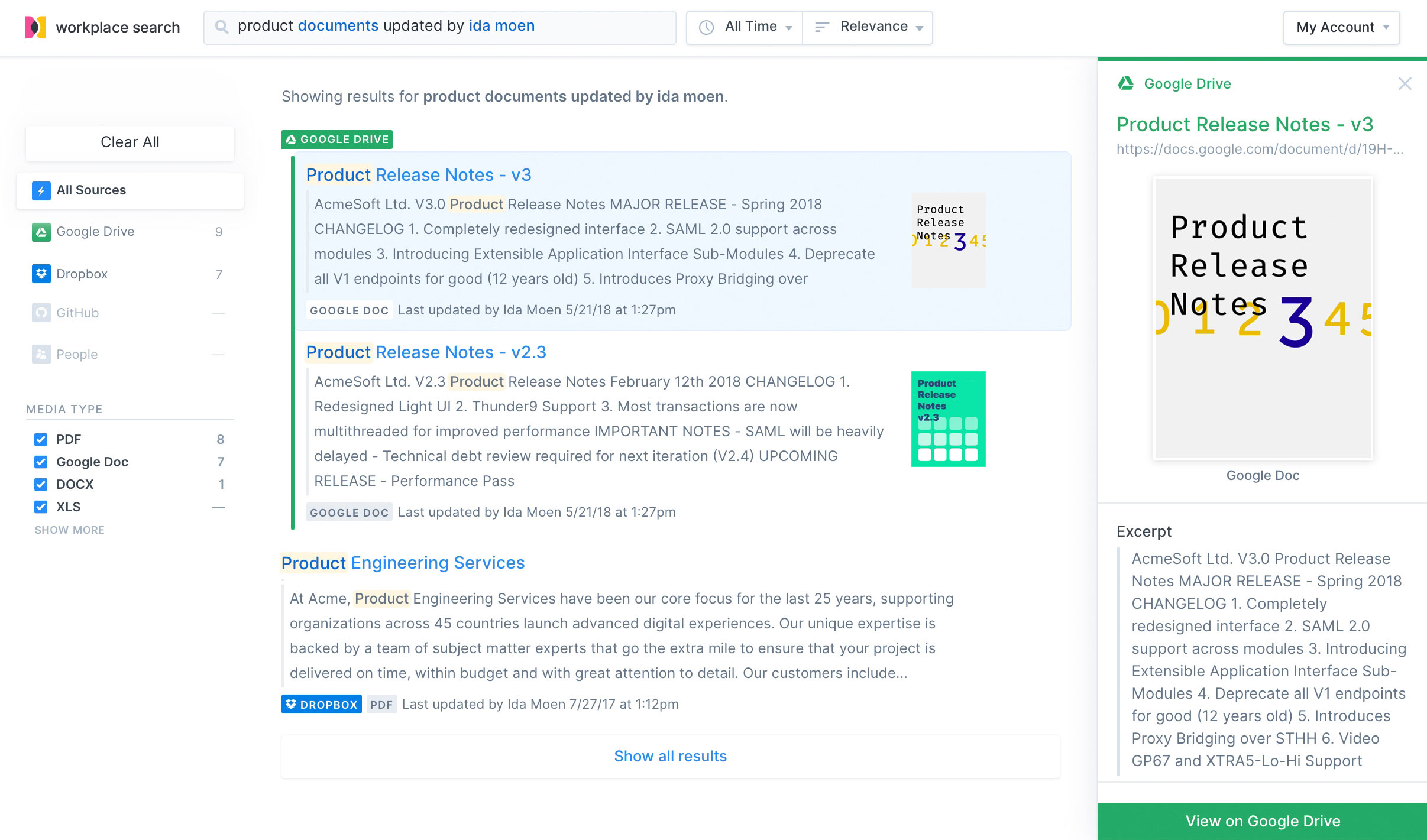 Elastic Workplace Search 使查找工作中的信息不仅有效,而且很愉快。 凭借其高度优美,用户友好的搜索 UI 和开箱即用的相关性。 在搜索时,请利用有用的功能,如文档预览和高级关键字检测(“ document” = .pdf,.doc,.xls等)。 有了搜索功能,办公室里的每个人都终于有了自己的私人助理。