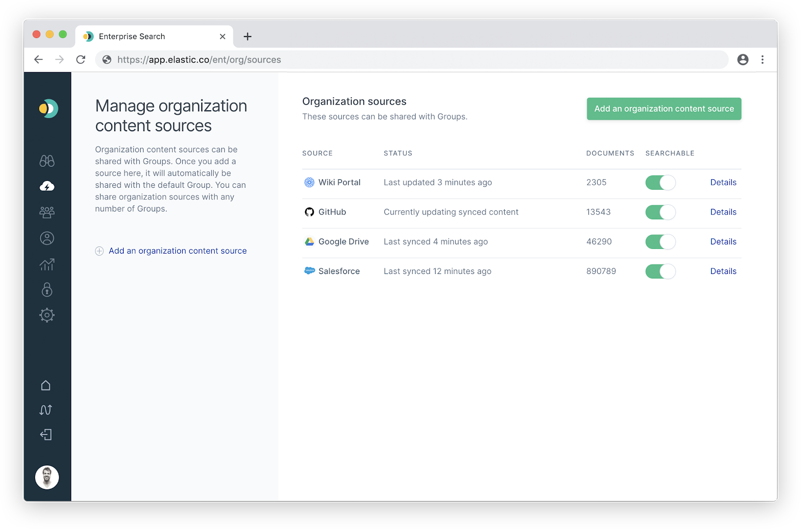 Elastic Workplace Search 附带了云应用程序连接器,可让你在短短几分钟内开始学习。 对于第一个 beta 版本,我们重点介绍了当今现代组织中最常用的云应用程序: