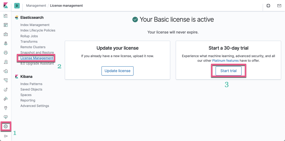 根据 Workplace Search 的安装要求,我们需要购买 Elasticsearch Platinum license,或启动 30 天的试用。在今天的实验中,我们来启动 30 天试用。我们打开 Kibana: